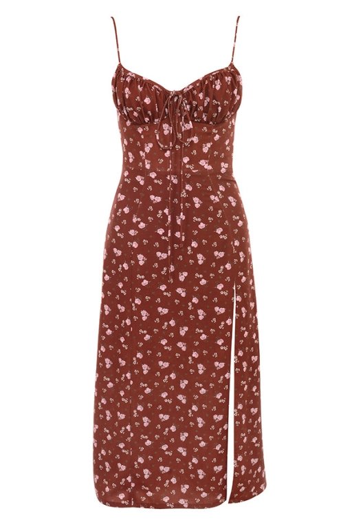‘Carina’ is ultra feminine and perfect for transitional Fall dressing. It’s cut from a weighty fabric that hangs beautifully and has a dainty wine and pink floral pattern. The pretty gathered bust fastens with a drawstring tie and the side thigh split adds a little sexiness. It’s fully lined as usual and we love this teamed with boots and leather jacket.