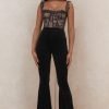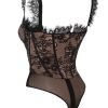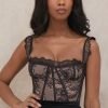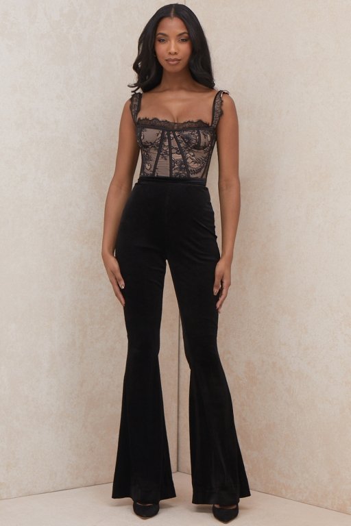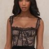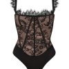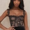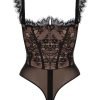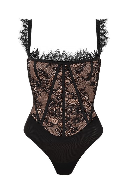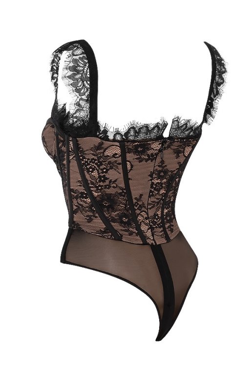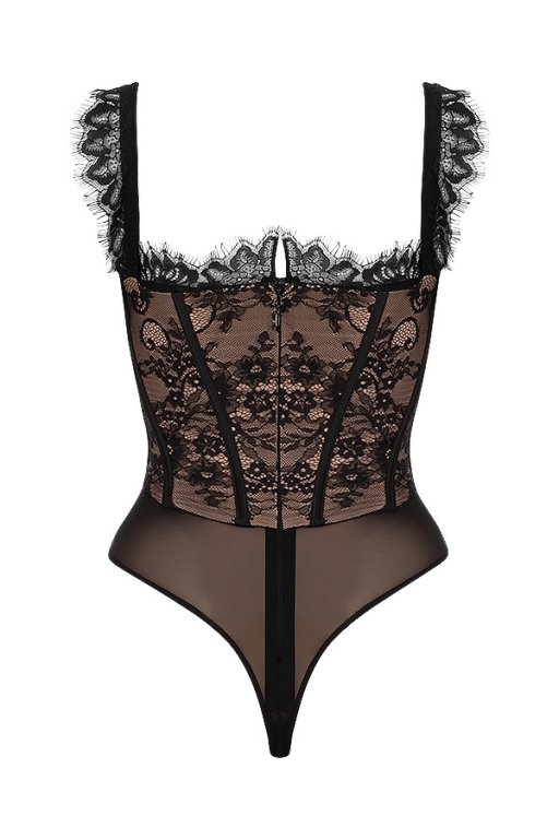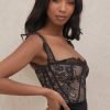 Our ‘Emilie’ bodysuit is designed with an even balance of elegance meets sexy. It’s cut from a delicately embroidered black lace with tonal silk-satin trims and backed in a nude power mesh for complete coverage and carefully thought out to keep it super smooth and comfy. The internal structure features our incredible corsetry boning to cinch the figure right in and the softly lined underwired cups really flatter the bust by creating a volumising lift and the perfect shape. We love the pretty lace trim that sits just above the neckline and along the shoulder straps for a real feminine touch. The bodice is boned right down to the briefs that are lined a power mesh that sculpts the figure from within, acting like shapewear but built into the briefs. It has a hidden hook and eye fastening and a zip to the back. Wear yours with our ‘Bisou’ wet look trousers for a super sexy tonal vibe.