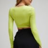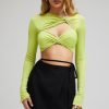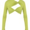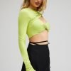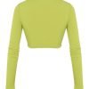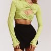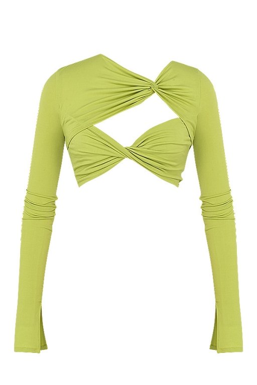 ‘Solitude’ is bold and confident yet evokes playful dressing. It’s made from a soft stretch jersey in a tropical lime with an asymmetric neckline and artfully twisted at the front with a distinctive cutout to highlight your frame. It has long sleeves with a slim fitting silhouette and cropped hem. Compliment the lime tone with our ‘Tranquil’ Blue Jersey Twist Front Mini Skirt.