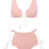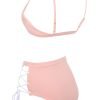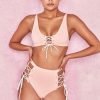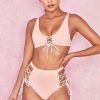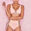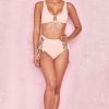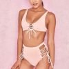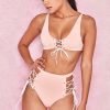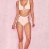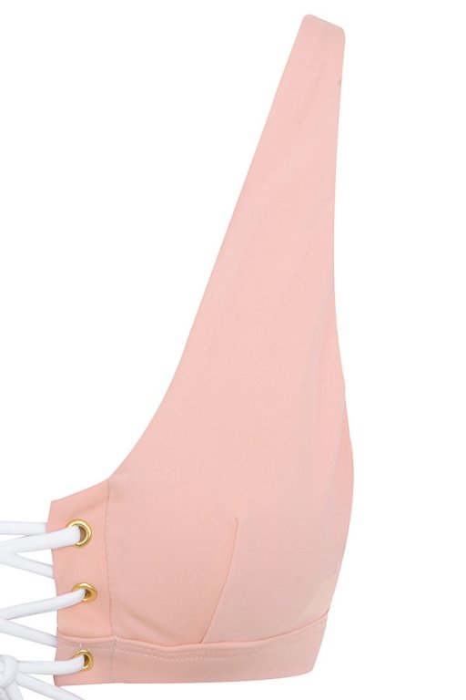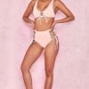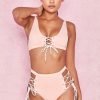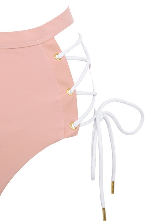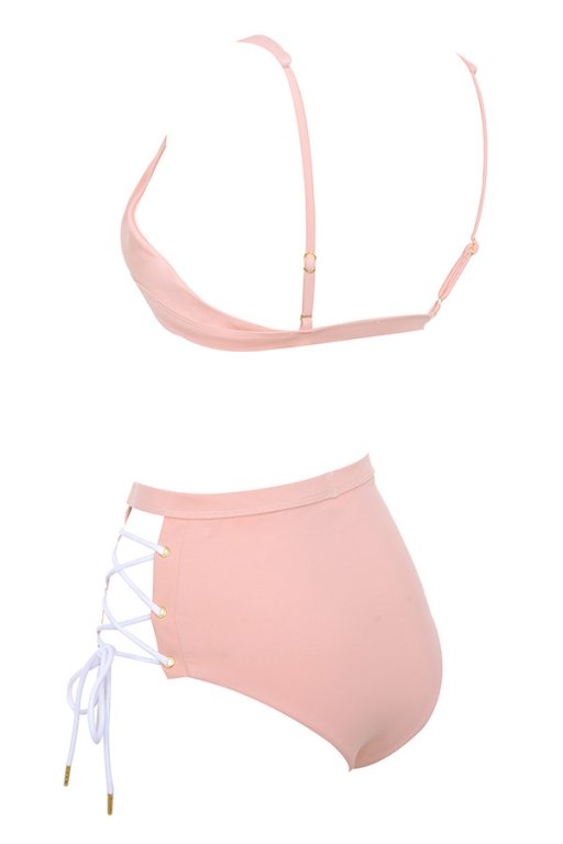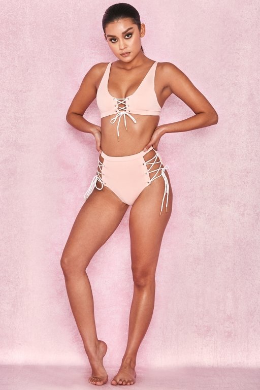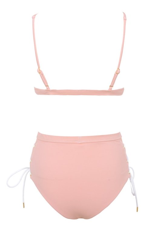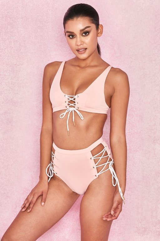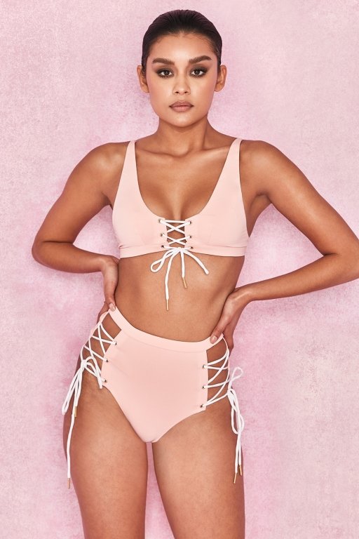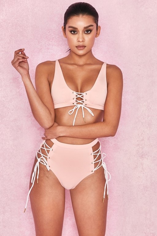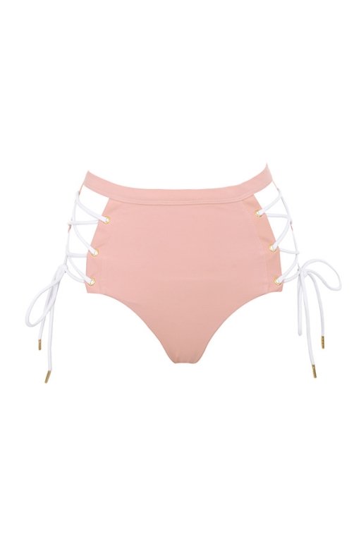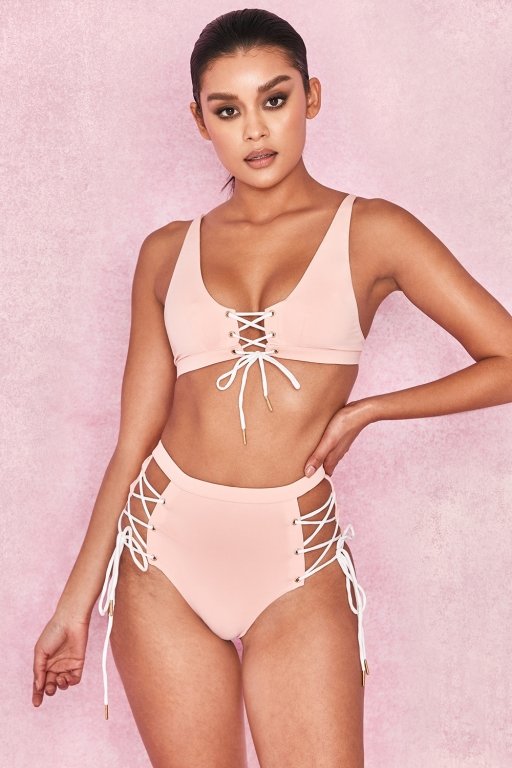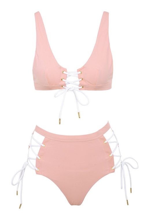 We love the pin up vibes of ‘Muscat’. Crafted from a matte stretch material, ‘Muscat’ comprises a two piece bikini in soft feminine tones. The lace up details are super sexy and the high waisted pants are reminiscent of retro glam. Wear yours with a white cover up and high heels for poolside glam.