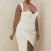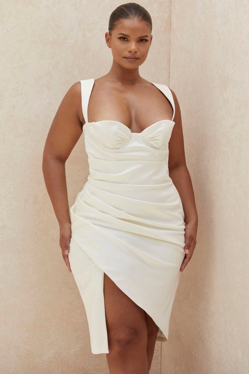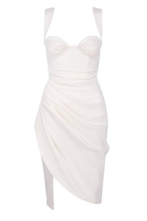 Perfect corsetry teams with dramatic draping in ‘Omaria’. Cut from our ultra luxe double duchess satin, ‘Omaria’ features a gathered cupped design and a draped skirt. The bodice has underwired and lightly padded cups that are luxuriously lined in satin for the smoothest fit. It features amazing corsetry to the front back and sides for the ultimate in support and the waist is super cinched. The skirt drapes over the hips in ultra flattering gathers to create that perfect hourglass shape. No bra needed under this one and the pretty shaped straps are adjustable for your perfect fit.